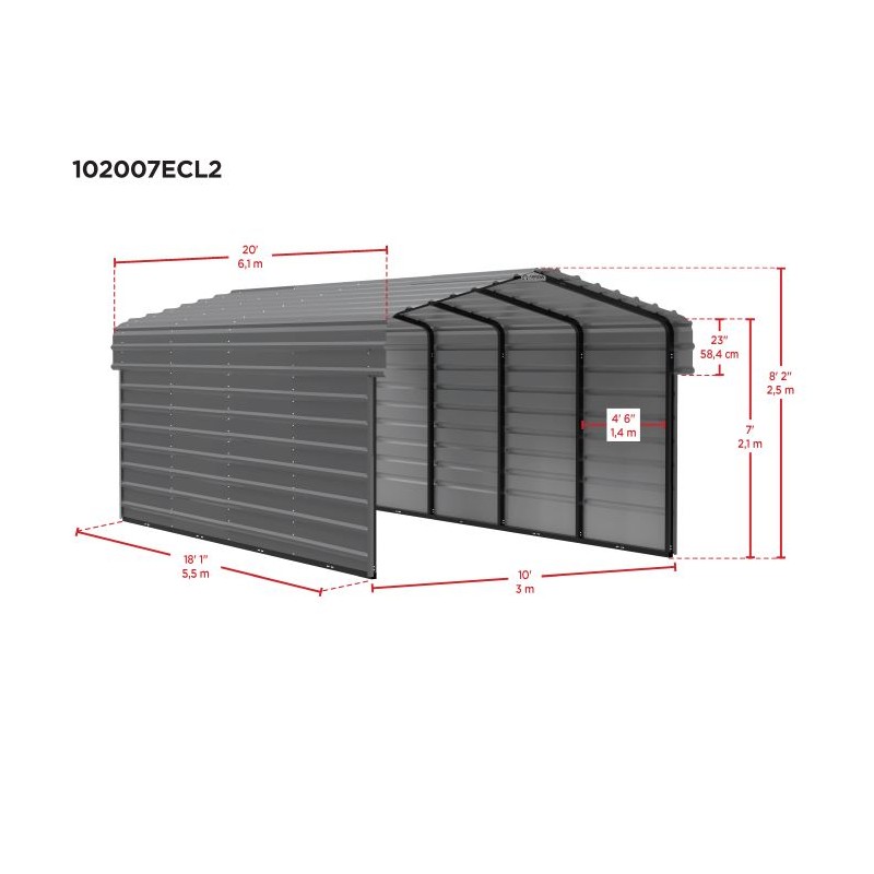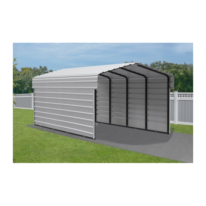 Introducing the all-steel Arrow Carport with Enclosure, a versatile solution tailored to fulfill your shade and shelter needs regardless of the weather. Crafted with meticulous attention to detail, its robust 2-inch square tube powder-coated steel frame ensures durability and resilience against challenging weather conditions. Engineered for seamless assembly, its innovative slip-fit frame connection, featuring pilot holes and self-drilling screws, guarantees hassle-free setup straight out of the package. With thoughtful design elements such as rounded roof eaves and a 12-inch overhang at the roof gables, this carport provides enhanced protection from the elements. Adding to its weather resistance, the heavy-duty 29-gauge galvanized steel sidewall, coordinated with the roof, can be effortlessly installed. Both the roof and sidewall panels boast an attractive Eggshell finish, enhancing the visual appeal of your outdoor space. Proudly manufactured in the United States with materials sourced globally, the Arrow Carport with Enclosure is backed by a reassuring 10-year warranty. Whether shielding your daily vehicle from the elements or creating a shaded retreat for your patio or outdoor gatherings, this carport stands as a reliable choice for all your sheltering needs.