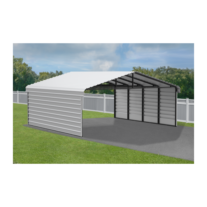 Introducing the Arrow Carports Galvanized Steel Carport with 2-Sided Enclosure a dependable and space-efficient shelter solution for your vehicles or outdoor equipment. It ensures to provides durability and protection. For more details, call us at 1-888-757-4337.