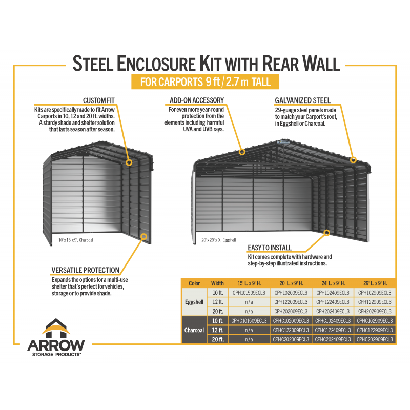 The Arrow Steel Carport with 3 Wall Kits (10x20x9) is the perfect way to protect your vehicles, outdoor gear, and other important belongings. With its spacious dimensions of 10 feet wide, 20 feet long, and 9 feet high, this carport provides plenty of room for cars, trucks, motorcycles, and more, making it a fantastic addition to any property. It's built tough to handle harsh weather, including heavy rain, snow, and strong winds. Plus, the three wall kits offer an extra layer of security and privacy, allowing you to create a fully enclosed area. This makes it ideal for use as a workshop, storage space, or even a recreational area. The walls are designed to match the carport's structure while giving you added protection from the elements. The all-steel Arrow Carport with Enclosure is a practical, versatile, and convenient solution for all-weather shade and shelter, perfect for any spot where you need to stay protected from the weather. Each Arrow Carport is rated for snow loads and built to withstand tough conditions. Grab one to keep your daily driver safe from the elements or to provide shade for your patio or party area.