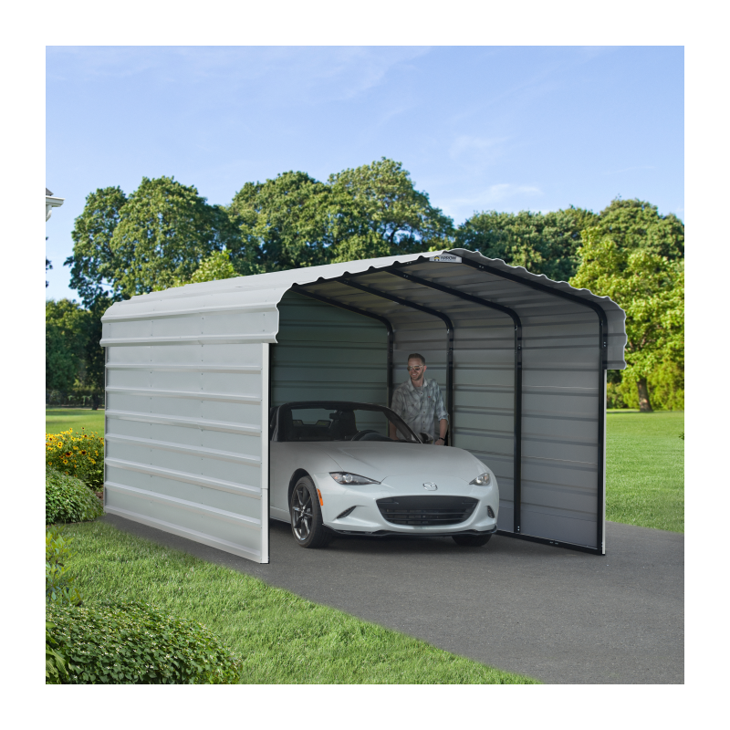 It provides shelter from the elements while offering easy access. Ideal for safeguarding your belongings or creating a covered workspace, this carport is a reliable solution for all-weather protection. For more details, call us at 1-888-757-4337.