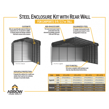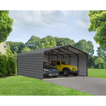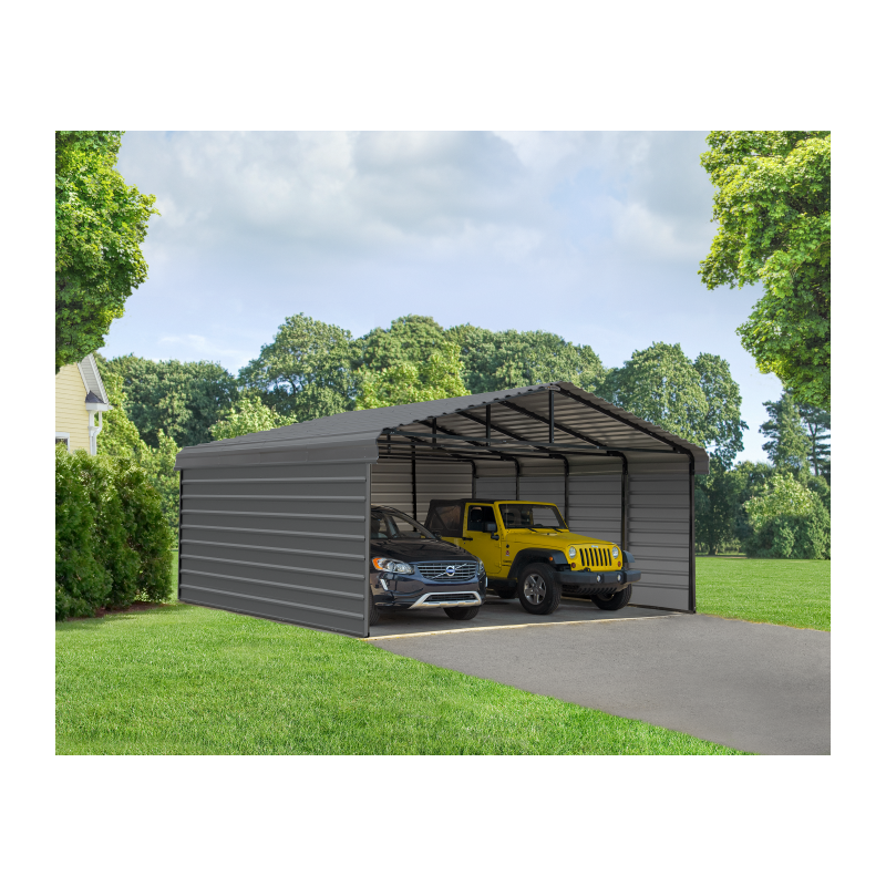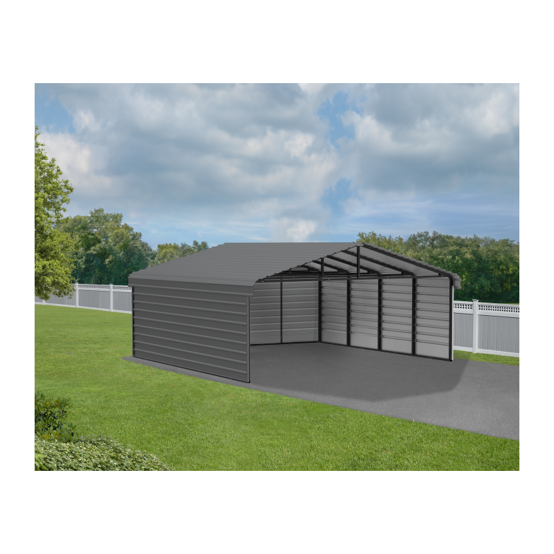 Looking for a way to keep your vehicles, outdoor gear, and other prized possessions safe from the elements? This spacious carport in charcoal is just what you need! Measuring 20 feet wide, 24 feet long, and 7 feet high, it offers plenty of room for cars, trucks, motorcycles, and more—making it a must-have for any property. The all-steel Arrow Carport with Enclosure is not only convenient and versatile but also a practical solution for all-weather shade and shelter, perfect for any spot where you need some protection. Each Arrow Carport is built to handle heavy snow loads and tough weather, so you can rest easy knowing your belongings are safe. Plus, with three wall kits included, you can add an extra layer of security and privacy, transforming it into a fully enclosed space. This makes it perfect for a workshop, storage area, or even a fun recreational spot. Setting it up is a breeze, thanks to clear instructions and all the hardware you need included, so you can get your carport up and running in no time. Whether you want to shield your daily driver from the weather or keep your patio or party area cool and shaded, this carport has got you covered!