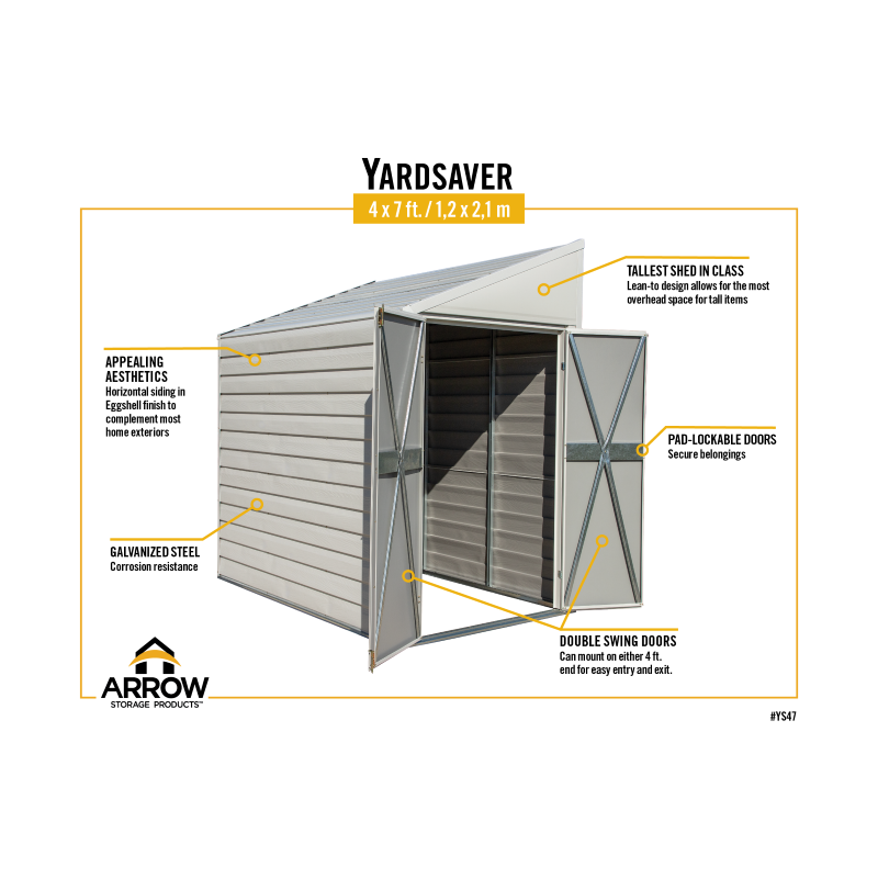 The Yardsaver 4'x7' steel storage building from Arrow is an all-time favorite. The lean-to design lets you place it against any outside wall. Get 154 cubic ft. of storage for many types of lawn & garden tools, lawnmowers, patio equipment, and more! Parts are pre-cut and pre-drilled for faster assembly. The roomy interior peak height is nearly 7 ft. tall! Doors mount on either 4 ft. end for your storage convenience. Attractive horizontal wood-grain embossed steel panels "drop-in-place" for easier assembly and complement many home decors. All parts are a pleasing eggshell color. In addition, the Yardsaver has a 12-year limited warranty.