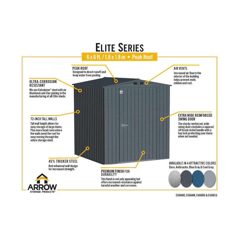 Expand the use of your backyard by adding the Arrow Elite Steel 6x6 Storage Shed in Cool Grey! This sophisticated yet corrosion-resistant shed has a wrinkle paint textured finish that is perfect for outdoor use and can let you store tools and other equipment! For questions and orders please call us at 888-757-4337.