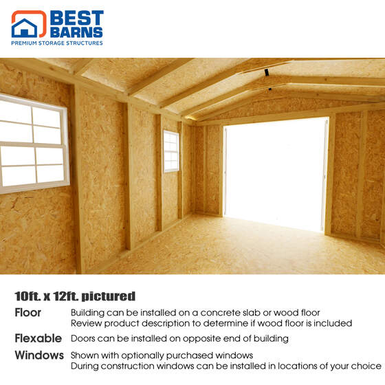 The Best Barns Handmade Haven 10x16 Wood Storage Shed Kit Centered Door on Gable blends seamlessly with the architectural styles of today’s homes. Its 6'-3" high side walls provide maximum storage capacity in a compact footprint. Large 5'-3" x 6' double doors make it easy to store your riding lawn mower, 4-wheeler, or other large equipment. Designed with Best Barns’ unique DIY-friendly construction, allows for easy customization to fit your needs.