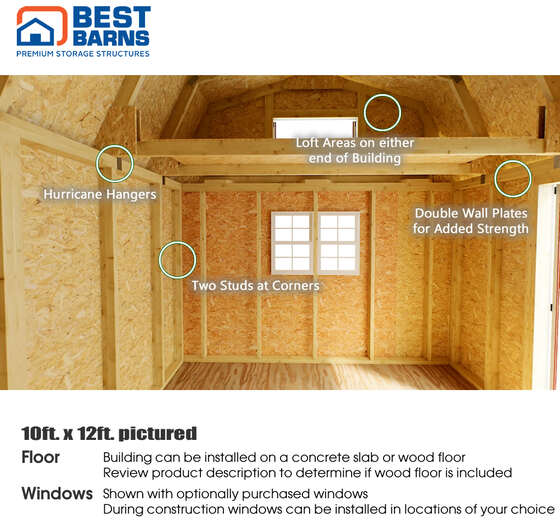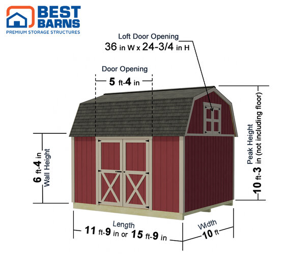 The Best Barns Craftsman's Cove 10x12 Barn Kit combines classic style with practical storage. Features include a gambrel roof, split loft with operable door, and centered barn doors on the eave side. Built with premium Eurowood, LP SmartSide, and SecureTruss for strength and longevity. Customizable design lets you choose windows, flooring, and roofing. For more details, please call us at 888-757-4337!