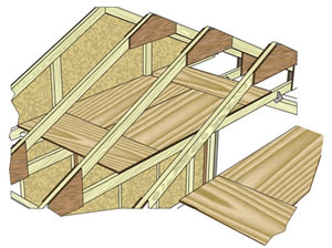 The Overhang Oasis wood shed features a second-level loft built with OSB (oriented strand board), offering plenty of additional overhead storage space. Our Specialty Overhang Oasis storage shed kit features a built-in loft that adds valuable storage without taking up additional yard space. This elevated area is ideal for keeping boxes, outdoor cushions, and other items neatly off the floor. Each end of the shed includes a 4-ft-long loft platform, and the 14-ft-wide structure provides three truss bays between the loft sections for convenient overhead storage.