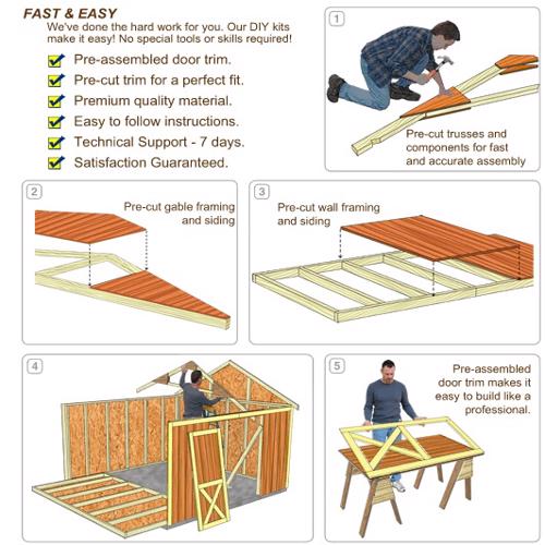 Once you receive your new building begin by unpacking the pre-cut framing, doors and hardware. You will also receive a detailed manual with step by step instructions. Each step is explained with clear instructions and detailed line art and has been developed with the novice builder in mind. Best Barns wood shed kit components fit easily into place with no special tools or skills required!