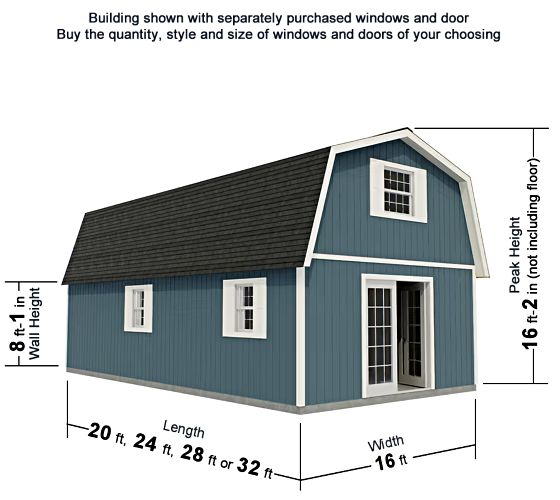 Note: Doors, windows, shingles, drip edge, flooring, and paint are not included and must be supplied by the homeowner. Images shown with swing doors, windows with shutters, a side entry door, sunburst gable windows, and full roofing package are for inspiration only. These items are optional upgrades and sold separately. Customize your shed with these and other options available above!