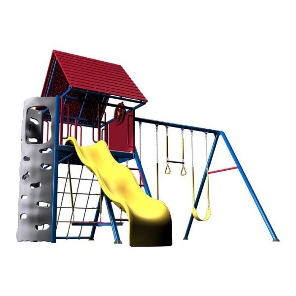 This Playset comes in Primary Colors (Red, Blue, and Yellow) with a heavy-duty, weather-resistant powder-coated steel, and high-density polyethylene (HDPE) plastic. The kids can also enjoy the activities they can do such as swinging in the two belt swings, one trapeze swing, and one propeller swing. They can also engage their mountaineer dreams with a climbing wall and a climbing cargo net. They can also take a break and play a teacher-student role with their very own activity chalkboard! A wavy slide will surely be a crowd favorite and let their inner pirate sail with the look-out deck with captain's wheel and over-sized binoculars!