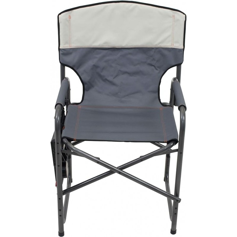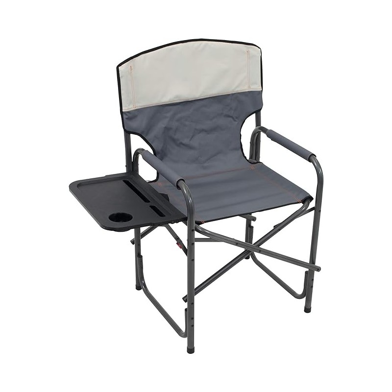 Enhance your outdoor adventures with the RIO Gear Broadback Compact Fold Directors Chair, perfect for picnics, beach parties, sporting events, or backyard gatherings with family and friends. Available in two stylish colors - Blue Sky/Navy and Slate/Putty - this folding chair has become a best seller for its broad back design that offers extra width and height compared to other chairs on the market. The chair also features a practical shelf with a drink holder, iPad slot, and cellphone slot for added convenience. The armrest is lined with high-quality fabric for maximum comfort. When it's time to pack up, the table can be folded flat against the chair frame, and the entire chair collapses for effortless storage.