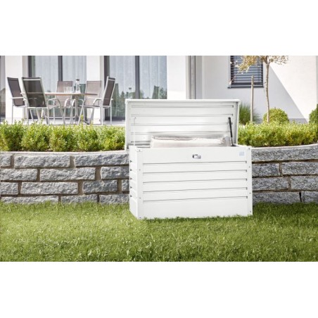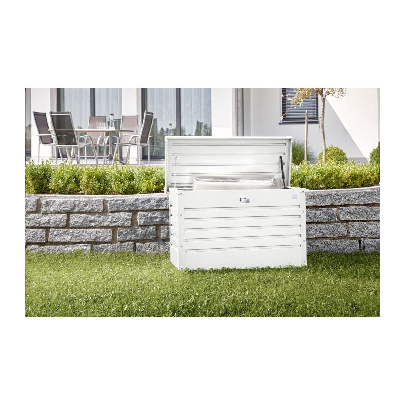 Keep your outdoor essentials safe, dry, and neatly organized with the Biohort Leisure Time Deck Box in White. Expertly designed and manufactured in Austria, this box is crafted from robust, galvanized steel for long-lasting durability. Its clean, timeless design complements any outdoor setting—whether it's your backyard, poolside, terrace, or patio. Ideal for storing large items such as patio cushions, pool accessories, chair pads, covers, lawn games, and garden tools, it offers both style and function. The hinged lid allows for easy access, while the integrated key lock provides added security when not in use.