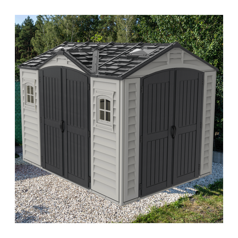 Hide away your clutter, lawn equipment, bikes, and more in this new stunning vinyl shed from DuraMax! The Apex Pro is the newest shed added to the Premier line. This shed comes with a double side door that is accessible from the front and side of the shed ensuring maximum utilization of storage and easy access to stored items trapped on the other side. This shed was attractively designed to add beauty to your yard and blend into any backyard setting. The walls and roof are built using fire-retardant vinyl resin panels. The frame is constructed of heavy-duty galvanized steel beams and trusses for strength and roof snow load. Follow the simple instructions in the owner's assembly manual and complete your new shed quickly with just two people.