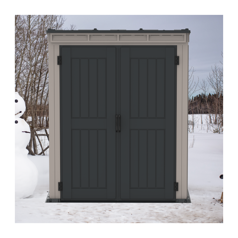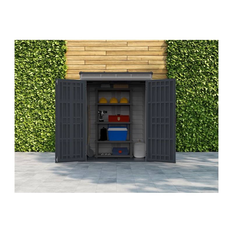 The YardMate Pent 5' x 3' Shed is built to last with the toughest all-weather durably vinyl resin and reinforced with a strong steel structure. The wall columns are reinforced with steel which allows you to easily mount shelves or garden tools. It has a comfortable interior wall height and a roof degree of 10°. This functional backyard shed also comes with wide double doors that are large enough to let you optimize the full use of the storage volume.
