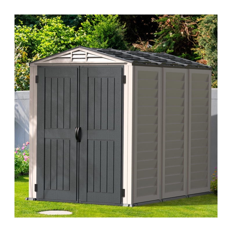 The advanced YardMate Plus 5’ wide x 8' deep is the perfect size for most backyards or patios as an extra storage space. This shed features a complete floor and its assembly is very simple, requiring only a few household tools. The YardMate is build to last with the toughest all-weather durably vinyl resin and reinforced with a strong steel structure. The wall columns are reinforced with metal which allows you to easily mount shelves or garden tools. This functional backyard shed also comes with wide double doors that are large enough to let you optimize the full use of its storage volume. The YardMate Plus is also available in a 5' x 5'.