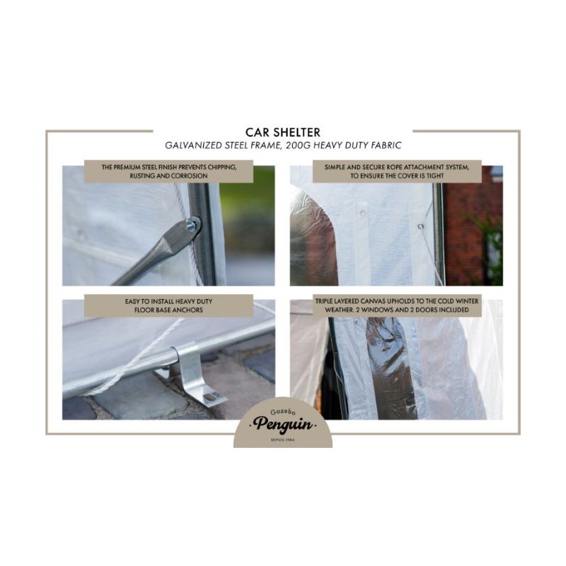 This carport shields your vehicle from winter conditions. It features two windows, two doors, and ropes to secure the front door. This carport is an ideal storage solution for small to medium cars, lawn mowers, tools, bicycles, motorcycles, and small trucks. Made from a robust 1 1/4-inch galvanized steel frame, the high-quality steel finish is designed to resist chipping, rust, and corrosion. Ideal for use in driveways, backyards, or outdoor events, the Gazebo Penguin car shelter combines practicality with style, making it a perfect addition to your outdoor space. Keep your vehicle safe and secure with this reliable car shelter kit!