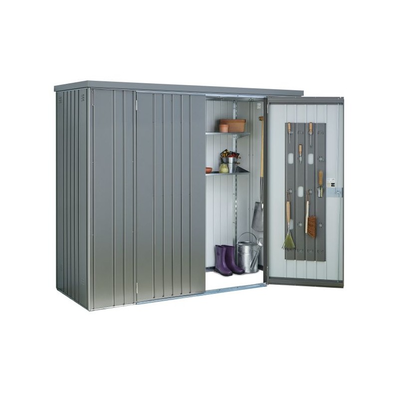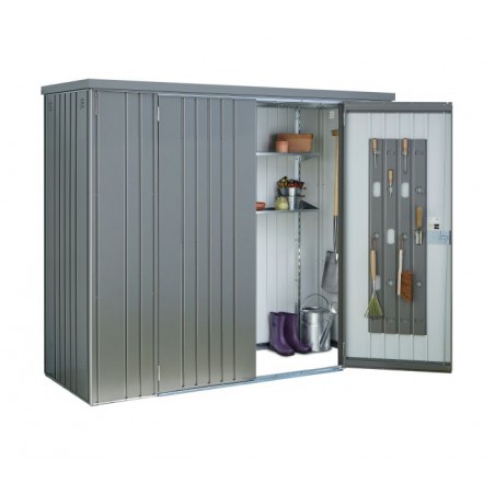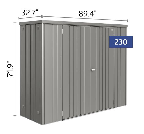 The Biohort Equipment Locker 230 (7.5' x 2.7' x 6') in Quartz Gray offers a sleek, secure, and weather-resistant storage solution for garden tools, outdoor equipment, and more perfect for compact spaces with modern style. For more details call us at 1-888-757-4337.