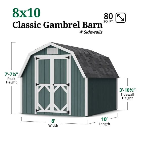 This durable and easy-to-assemble 8x10 wood shed kit from Little Cottage Co. Classic Gambrel series features a timeless gambrel barn design, 4-foot sidewalls for extra storage space, and provides the perfect backyard solution for tools, equipment, or garden supplies. For more details, call us at 888 757 4337.