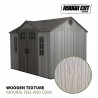 The Lifetime 10x8 Shed 60330 features: Doors with 8 panel windows, slider latch lock mechanism, (4) small skylights, (6) wall hooks, (2) side windows, (2) screened vents, (2) 90 in. x 9 in. shelves, and a 10-year limited warranty. Wood-grain designed floor and installation hardware included. Comes in (2) boxes.