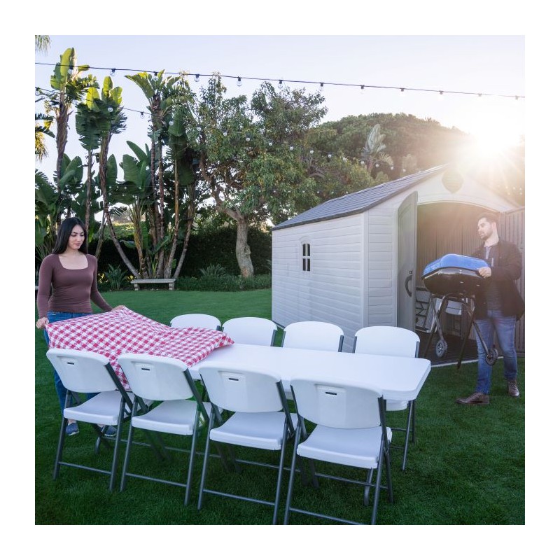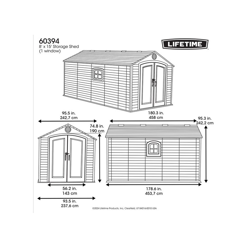 Need a durable and spacious solution for outdoor storage needs. Constructed with high-density polyethylene and reinforced steel, this shed offers ample space to store lawn equipment, garden tools, bicycles, and more. With lockable doors and a weather-resistant design, the Lifetime Outdoor Storage Shed keeps your belongings safe and secure year-round. For more details, please call 888-757-4337.