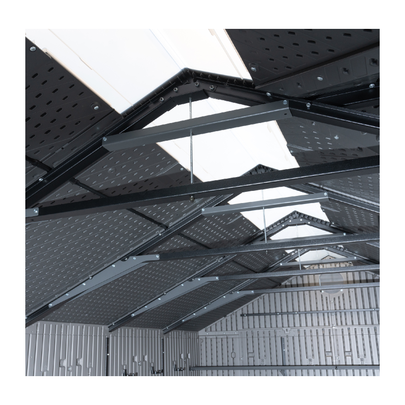 It includes: vertical siding, dual entry 3 pane doors, snow load kit, (8) large skylight, (2) windows with decorative windows, (2) 90 inch x 9 inch shelf, (2) 9.5" radius corner shelves, (2) storage pouches, (18) tool hanging wall hooks, (2) screened vents, and a 10-year limited warranty. Floor and installation hardware included. Comes in (4) boxes.