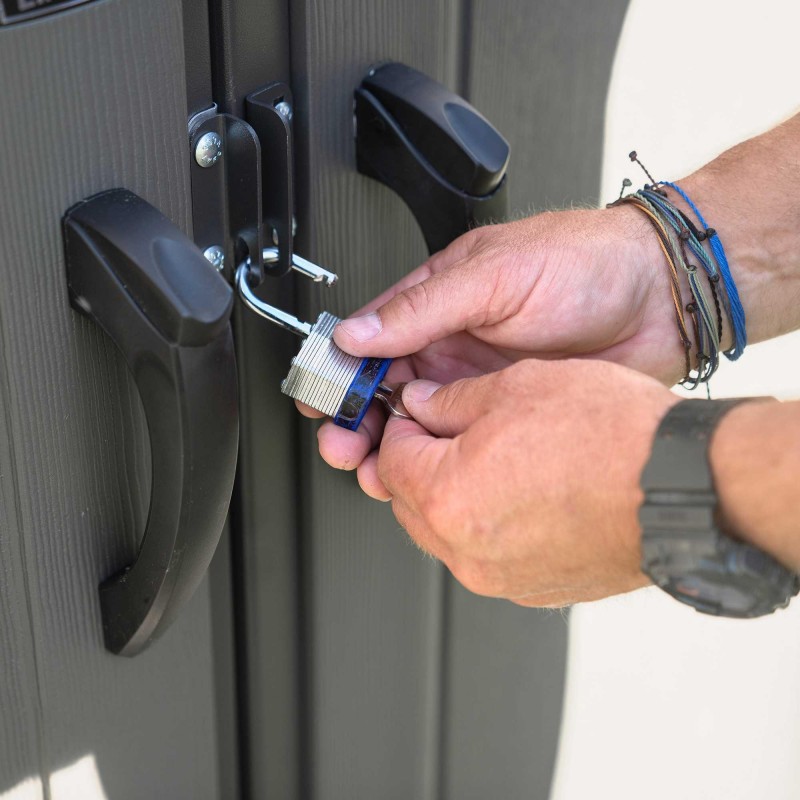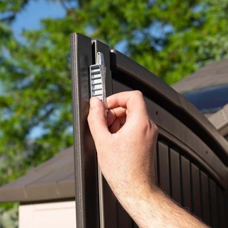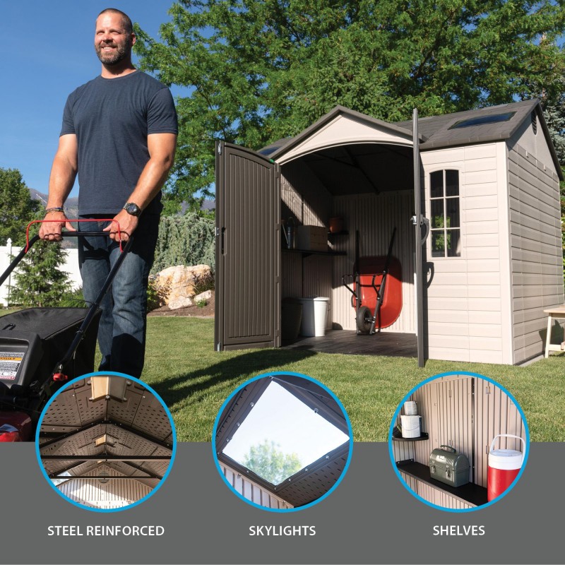 Get your storage problem solved with a shed from Lifetime products. This 10x8 shed features shelves and peg strips with tool hooks so you can find what you need, when you need it. Make life easier with a shed to keep your equipment and tools organized! Lifetime sheds are made from steel-reinforced, double walled polyethylene construction. Our sheds are strong, durable, and weather resistant to fading and cracking. They're also UV-protected, fade-resistant, and never need painting! Do yourself a favor and get organized with a do-it-yourself shed from Lifetime Products! Made in the USA and covered by a 10 year limited factory warranty.