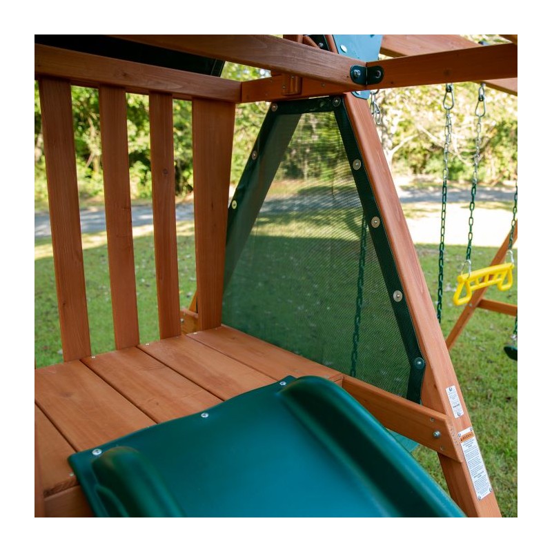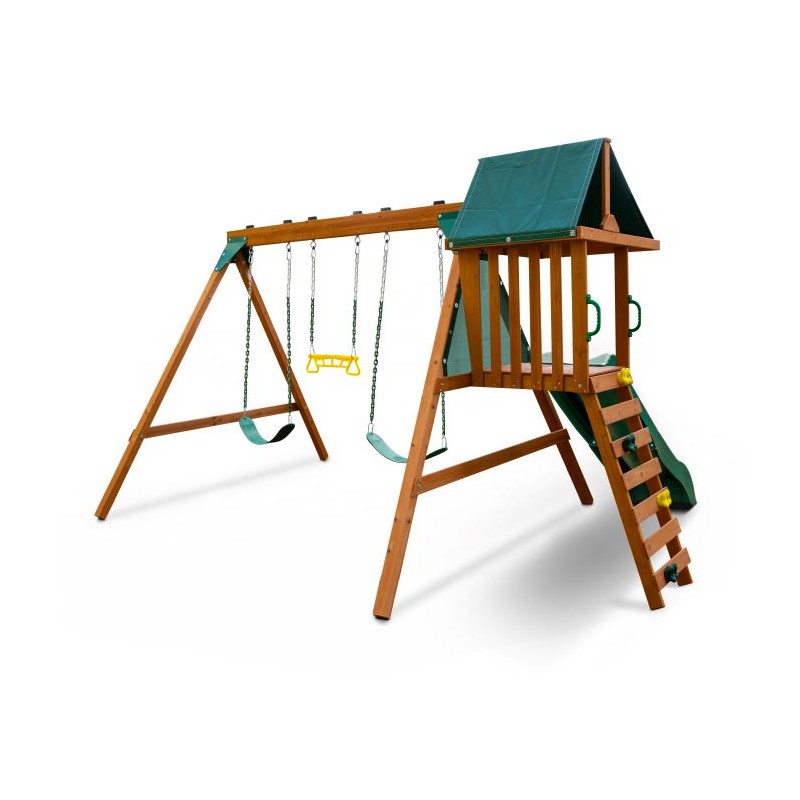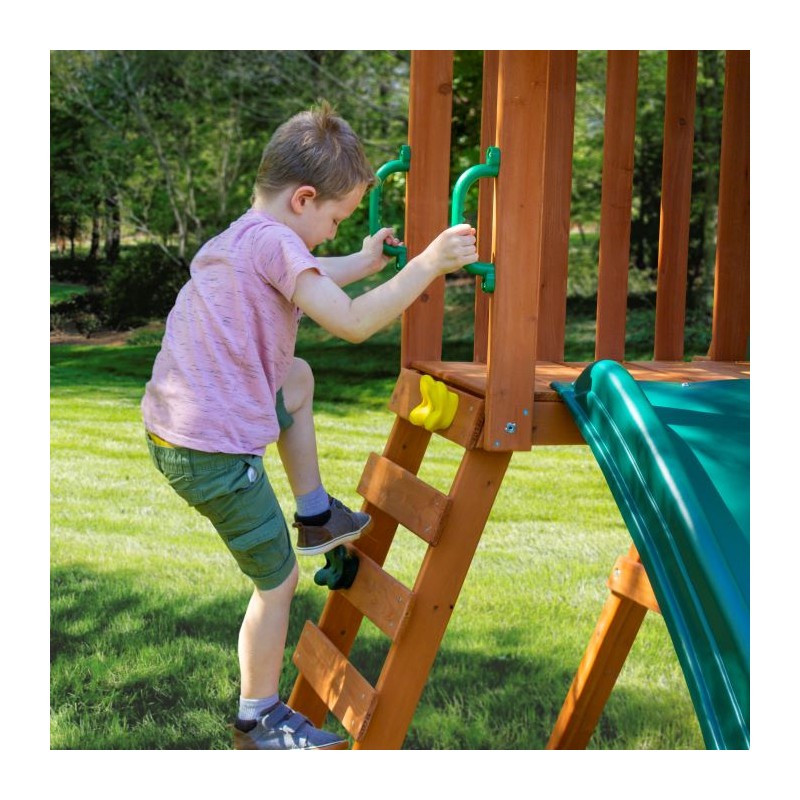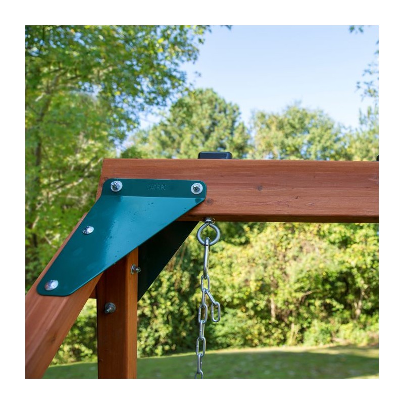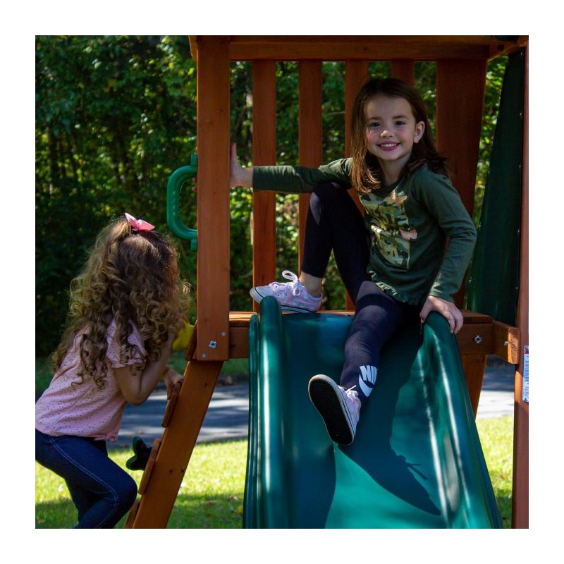 Adding to the excitement is the attached play deck, boasting a vibrant green two-piece plastic wave slide and a challenging climbing wall. These features promise hours of climbing and sliding fun, stimulating both activity and imaginative play. With fully illustrated instructions included, assembling this wooden play set is a breeze, allowing you to create a thrilling outdoor playground for your children in just one day. From swinging to sliding, climbing to playing, the Ranger Plus Swing Set offers an unparalleled outdoor experience for kids, fostering joy, creativity, and cherished memories.