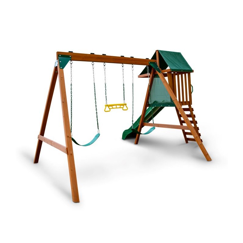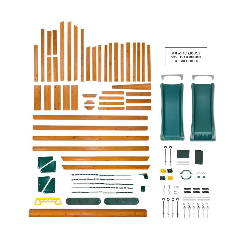 Elevate your children's outdoor adventures with the Basic Free Standing Swingset w/ Slide. Crafted from premium, pre-cut cedar lumber and equipped with all the necessary hardware and a slide for assembly, this versatile wooden swing set ensures endless entertainment for your little ones. Featuring a selection of swing seats including a ring/trapeze combination, each with coated chains for a secure grip, your kids will delight in the exhilarating back-and-forth motion. With a weight capacity of up to 115 pounds per swing and adjustable chains for variable height, safety and comfort are paramount.