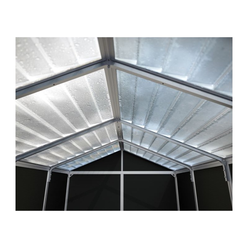 The Rubicon Shed from Palram - Canopia offers unmatched storage, organization, and protection for your outdoor essentials. Built with virtually unbreakable polycarbonate panels and a reinforced aluminum frame, it excels in robustness and durability. Requiring minimal maintenance, it ensures years of reliable service. Unique polycarbonate skylight roof panels allow natural sunlight while maintaining privacy with an opaque exterior. Resistant to fracturing, bending, and discoloration, even in harsh conditions like hail and high temperatures, the Rubicon Shed is designed to complement your home and elevate your outdoor living experience.