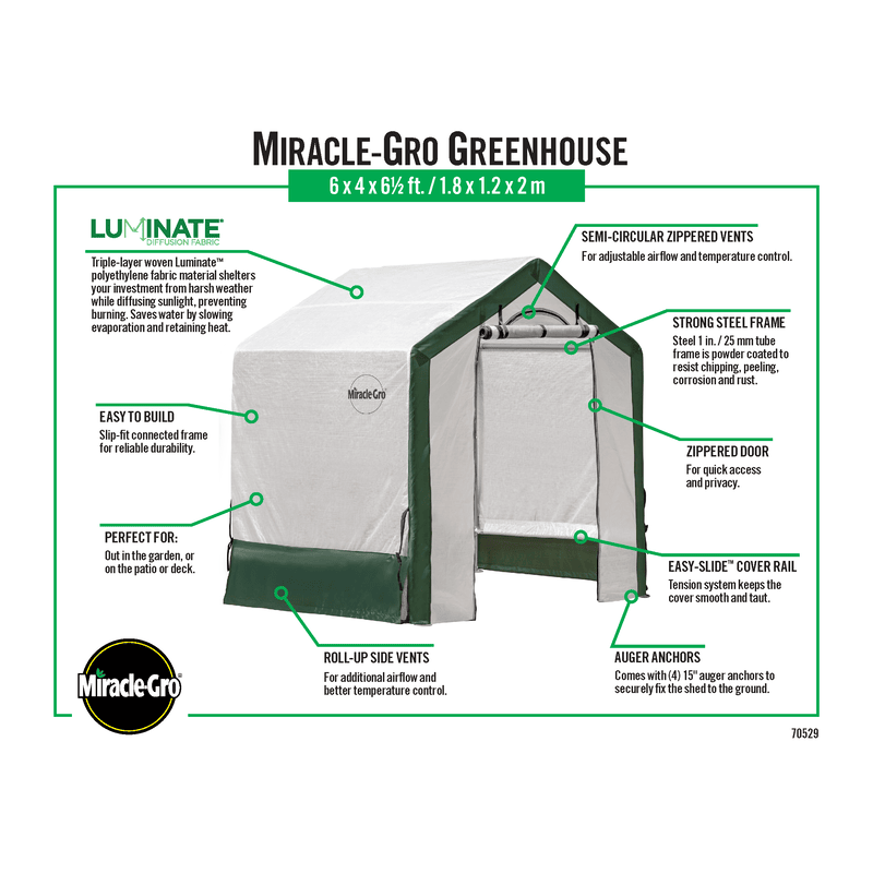The Miracle-Gro Greenhouse is designed for quick and easy assembly, featuring a robust carbon steel frame that is secured with nuts and bolts. It comes with a single-piece, triple-layer ripstop cover made from Luminate Light Diffusion Fabric, which is treated for UV protection and effectively blocks harmful UVA and UVB rays. This translucent material protects your plants from severe weather while diffusing sunlight to prevent burning. The Miracle-Gro Greenhouse is ideally sized for your backyard or deck. Ideal for any backyard or deck, the Miracle-Gro Greenhouse is the perfect addition to your gardening setup.