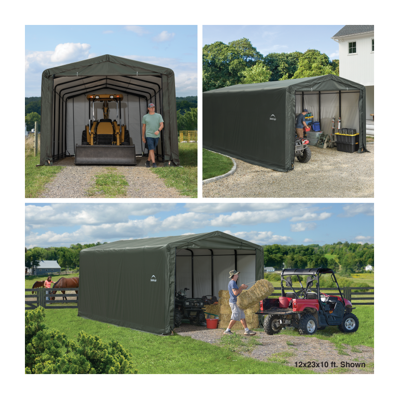 The newly improved ShelterTube garage and storage shelter is a fantastic choice for those seeking year-round protection for vehicles, boats, and other items. Constructed with a durable industrial-strength steel frame and a 9 oz. waterproof heavy-duty fabric cover, this ShelterLogic garage is rated for wind and snow loads, making it capable of withstanding harsh weather conditions when properly anchored and regularly cleared of snow. Additionally, the ShelterTube is fully customizable, with options available up to 100 feet in length and 20 feet in width. With its sleek green exterior, it blends seamlessly into your landscape while offering ample storage space. Easy to assemble and built to last!