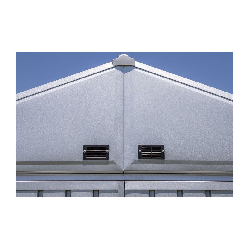 Explore the Arrow Elite series storage shed, meticulously designed to enhance any outdoor space with its modern squared wall design and anthracite textured wrinkle paint finish. Crafted from robust Galvalume steel and fortified with aluminum and zinc plating for exceptional anti-corrosive properties, this shed promises enduring durability. Benefit from ample headroom with its 72-inch tall walls and convenient walk-around space. The reinforced swing-open doors feature a sleek brushed nickel key lock handle for seamless access and security, complemented by gable vents that ensure optimal airflow. Complete with all necessary assembly hardware, this shed stands ready to effortlessly elevate your backyard or garden storage solutions.