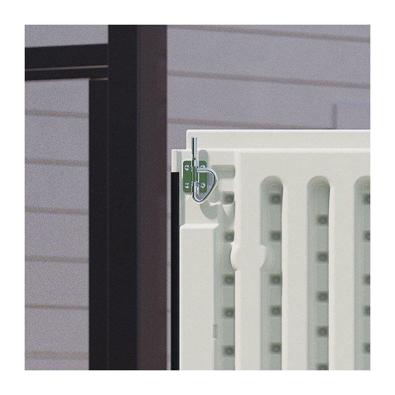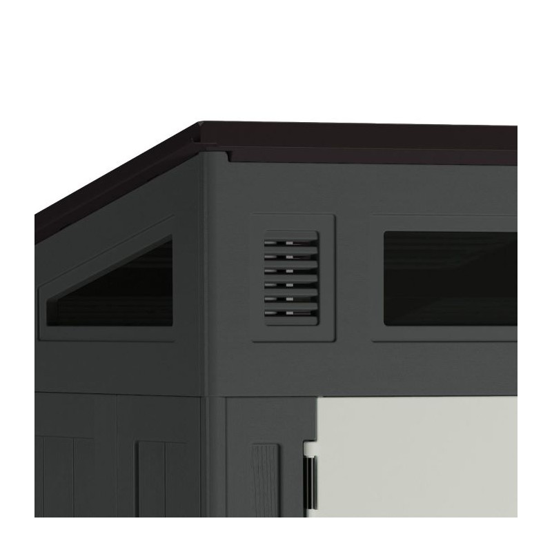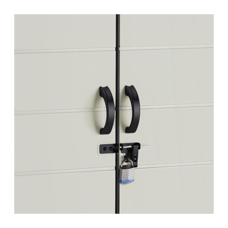 This shed has 200 cubic feet of storage space and is perfect for storing all your outdoor equipment. It's an ideal choice for those seeking to enhance their storage capacity. Constructed with a steel frame and multi-wall resin panels, it offers exceptional strength and durability, capable of withstanding heavy roof snow loads. The sturdy double doors provide easy access to your belongings, and they are designed to be pad-lock-ready for extra security (lock not included). Featuring large transom windows for natural light, it makes it simple to locate your items. This shed is not only aesthetically pleasing but also resilient, designed to endure various weather conditions throughout the year.