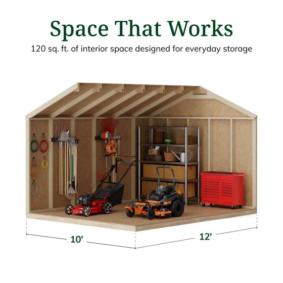 Step inside the 10x12 Value Gable Shed and enjoy full headroom and a spacious interior. Perfect for storing tools, outdoor gear, and seasonal items with ease.