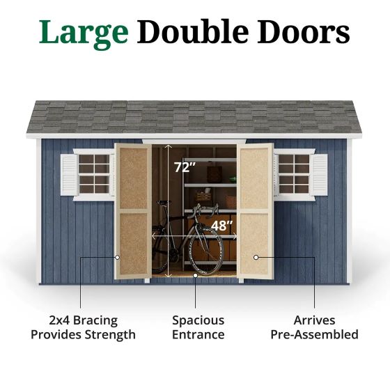 *Features double doors that come pre-assembled, complete with a secure locking handle and 2x4 support for added stability.