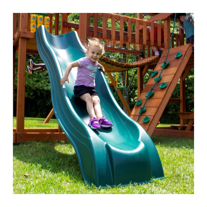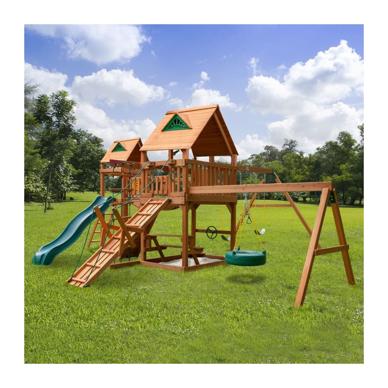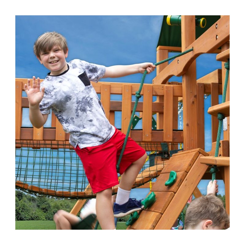 Gorilla Playsets Pioneer Peak Swing Set w/ Natural Cedar will keep the kids active for hours. Dexterity and strength are sure to be found, whether they're climbing up the ramp or swinging gracefully on one of the two included belt swings. There is a trapeze for the little gymnast and a tire swing for those not so ambitious. The two upper decks are connected with a clatter bridge. If your child has had enough, they can slide down the Wiki Wave Slide™ and play in one of two sandboxes. The set features several accessories like the tic-tac-toe panel and flag kits. Order yours today!