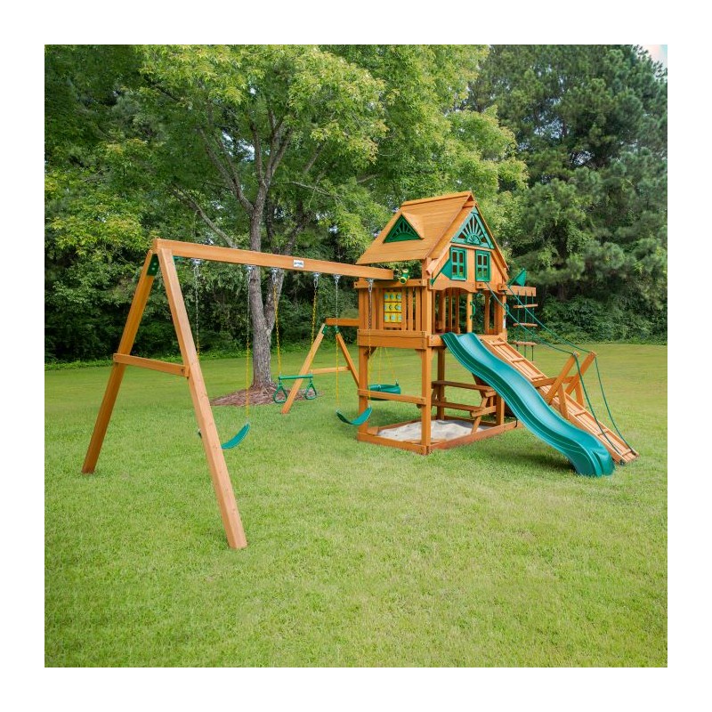 Gorilla Playsets Frontier Treehouse Swing Set w/ Amber Posts is a great addition to any backyard. The Deluxe Climbing Ramp is one of many ways to encourage good health. Their strength will be tested on the Rock Wall and the Deluxe Rope Ladder. This premium cedar wood swing set is pre-cut, pre-sanded, pre-stained, and ready to assemble in your backyard. The play deck is protected with a tongue and groove wood roof and includes an Upper-Level Treehouse with working shutters. The entire playset is finished in our exclusive maintenance-free Timber Shield. Gorilla Playsets' cedar naturally resists rot, decay, and insect damage.