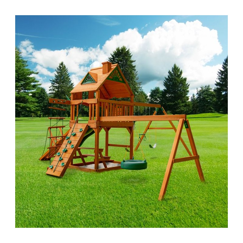 Gorilla Playsets Frontier Treehouse Swing Set w/ Amber Posts is a great addition to any backyard. The Deluxe Climbing Ramp is one of many ways to encourage our children's good development. Their strength will be tested on the Rock Wall and the Deluxe Rope Ladder.