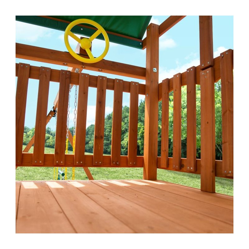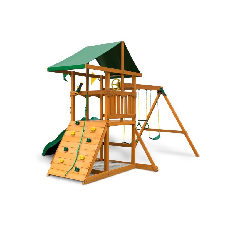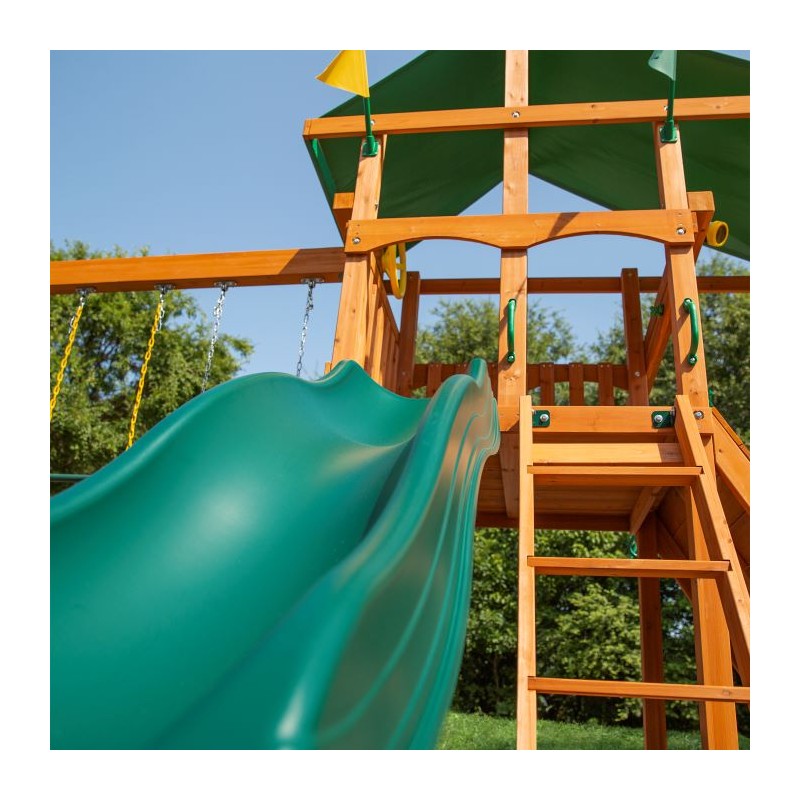 Transform your backyard into a haven of outdoor fun and relaxation with the Gorilla Outing Swing Set featuring a Deluxe Green Vinyl Canopy. Crafted with exceptional durability and thoughtful design, this swing set promises to be the centerpiece of your children's outdoor adventures. At the heart of the Gorilla Outing Swing Set is its robust construction, engineered to withstand the rigors of enthusiastic play. A premium addition that elevates the play experience to new heights. This stylish canopy not only adds a touch of elegance to the swing set but also provides essential shade and protection from the sun's rays, allowing children to play comfortably for extended periods. Equipped with classic swing attachments, including belt swings and a trapeze bar, as well as an exhilarating slide, this set offers endless opportunities for active play and exploration.